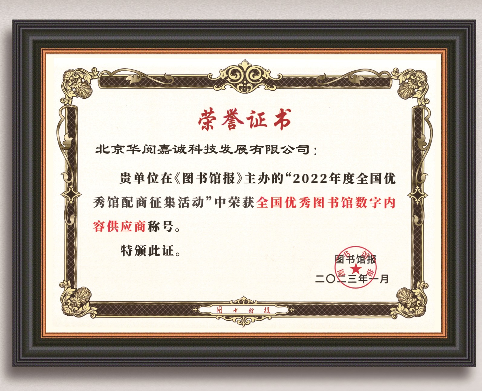华阅嘉诚荣获2022年“全国优秀图书馆数字内容供应商”称号。