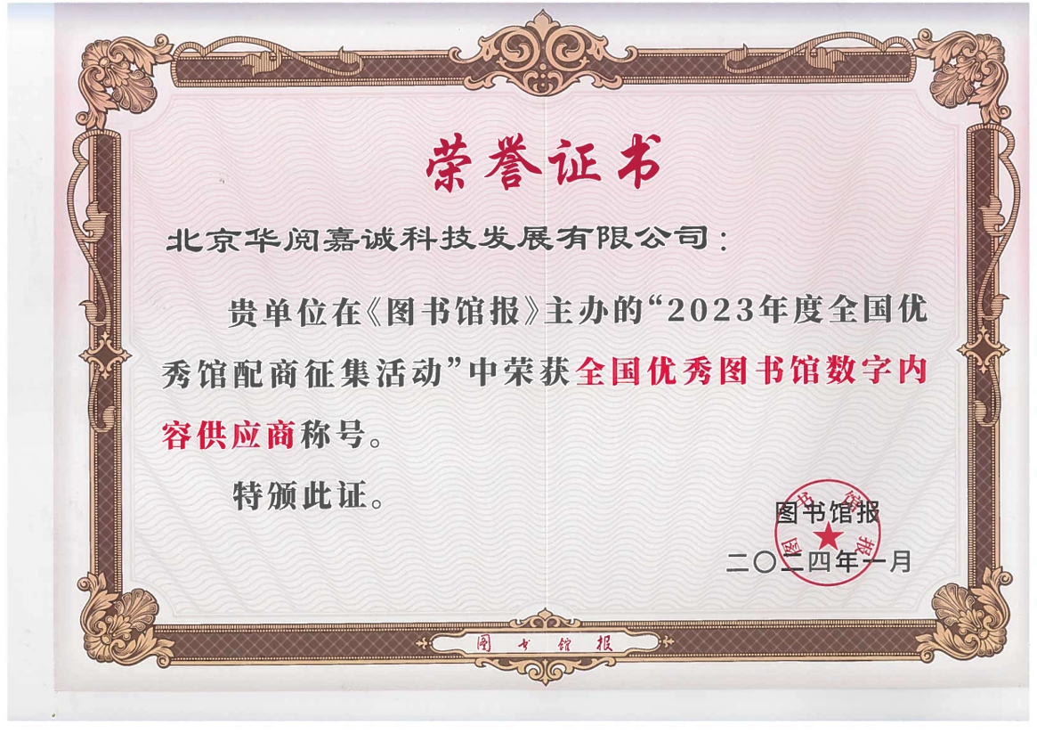 北京华阅嘉诚科技发展有限公司荣获2023年“全国优秀图书馆数字内容供应商”称号。